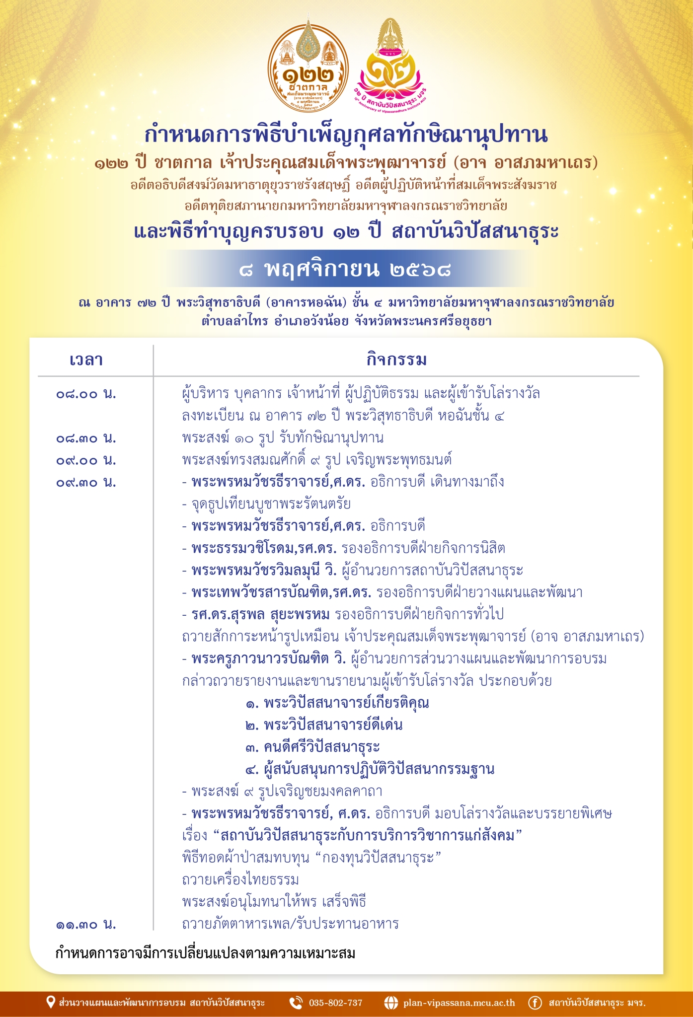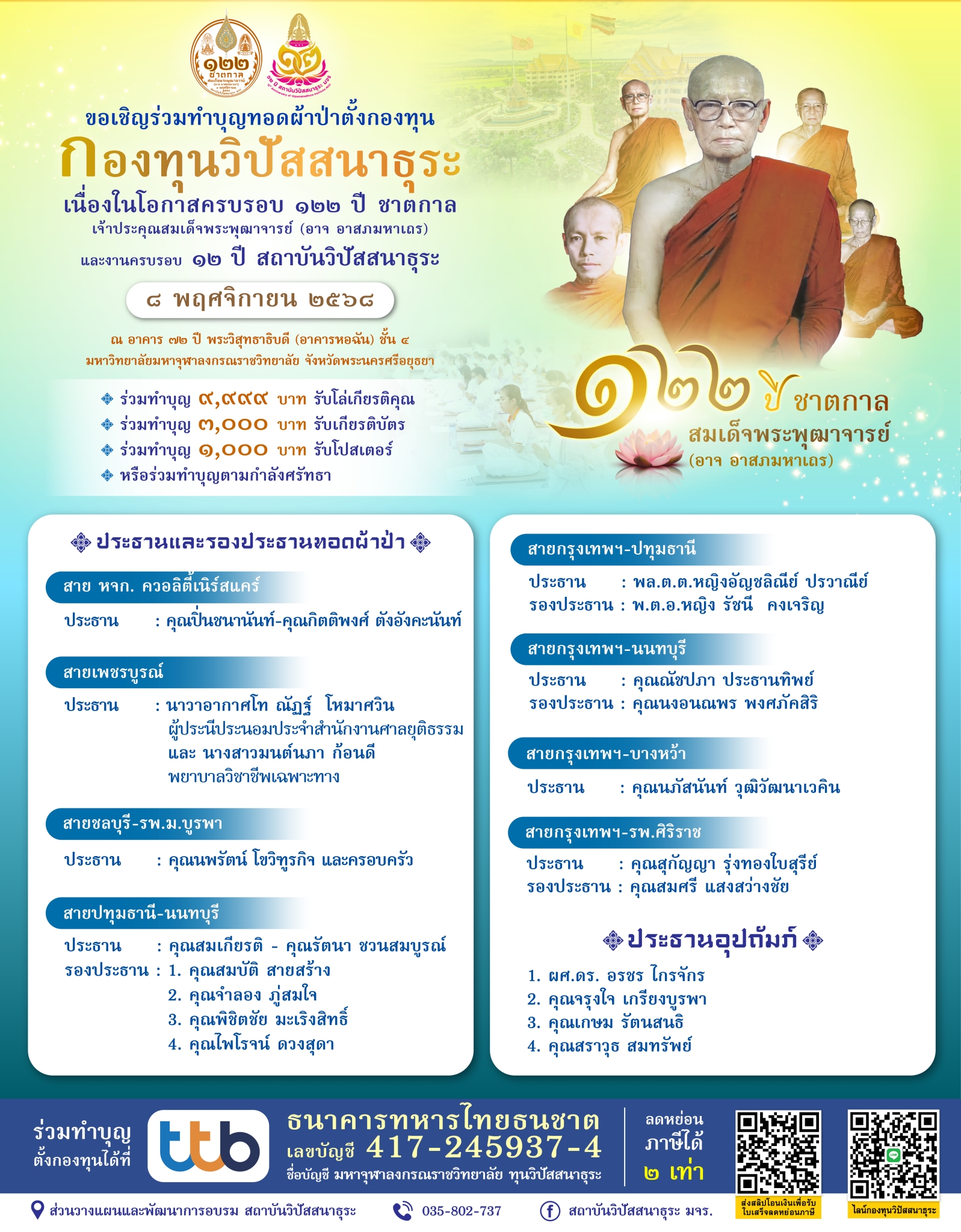 🙏ขอเชิญทำบุญทอดผ้าป่าตั้งกองทุนวิปัสสนาธุระ เพื่อการปฏิบัติวิปัสสนากรรมฐานเนื่องในโอกาสครบรอบ 122 ปี ชาตกาล พระเดชพระคุณเจ้าประคุณสมเด็จพระพุฒาจารย์(อาจ อาสภมหาเถระ)อดีตอธิบดีสงฆ์วัดมหาธาตุยุวราชรังสฤษฎิ์ราชวรมหาวิหาร อดีตผู้ปฏิบัติหน้าที่สมเด็จพระสังฆราช อดีตทุติยสภานายกมหาวิทยาลัยมหาจุฬาลงกรณราชวิทยาลัย และงานครบรอบวันสถาปนา๑๒ ปี สถาบันวิปัสสนาธุระ