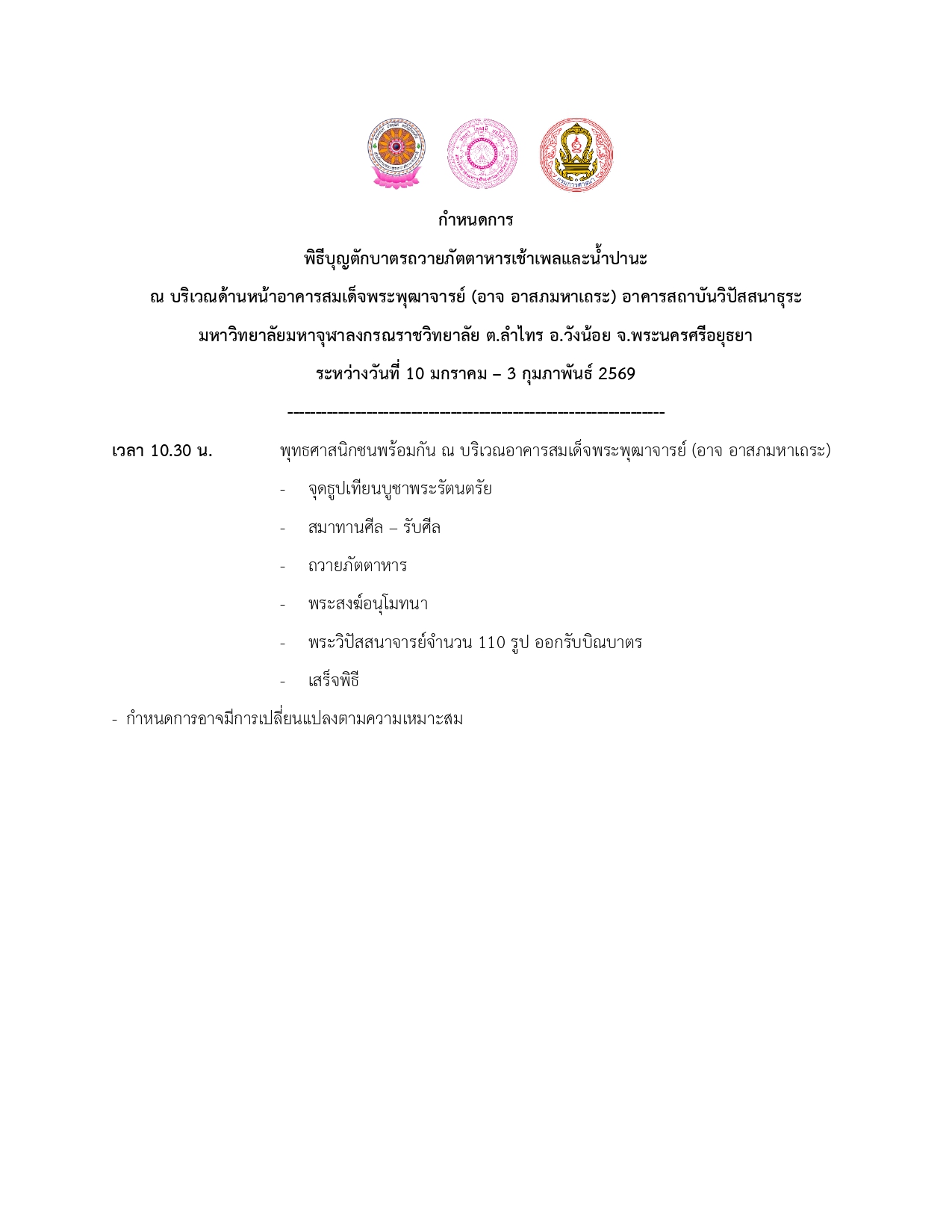 ❖ขอเชิญเจริญพรทุกท่านร่วมพิธีทำบุญตักบาตรแด่พระวิปัสสนาจารย์ จำนวน 100 รูป ❖ณ บริเวณด้านหน้าอาคารสมเด็จพระพุฒาจารย์ (อาจ อาสภมหาเถระ) อาคารสถาบันวิปัสสนาธุระ มหาวิทยาลัยมหาจุฬาลงกรณราชวิทยาลัย ต.ลำไทร อ.วังน้อย จ.พระนครศรีอยุธยา ❖เวลา ๑๐.๓๐น.เป็นต้นไป (สามารถร่วมทำบุญตักบาตรได้ทุกวัน)