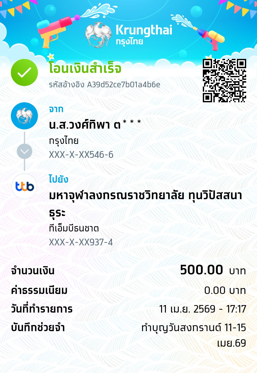 นาย ปริญเมศร์ สุรสิทธิศาสตร์ | 500.00 | 11/04/2026 17:20:37 | ||